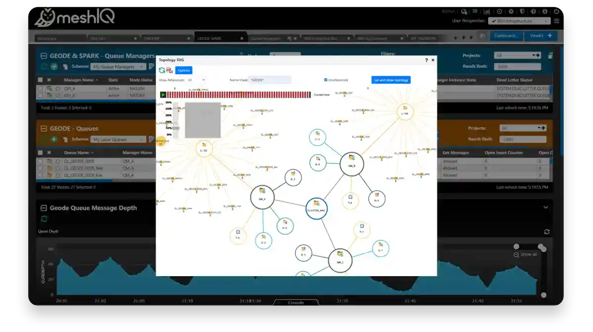 With meshIQ, you can dive deep into your message queues and topics to oversee your middleware systems’ performance, encompassing message trajectories, rate of messages, and accessibility. You can also proactively identify obstacles and bottlenecks, ensuring no interruptions to your shared services.